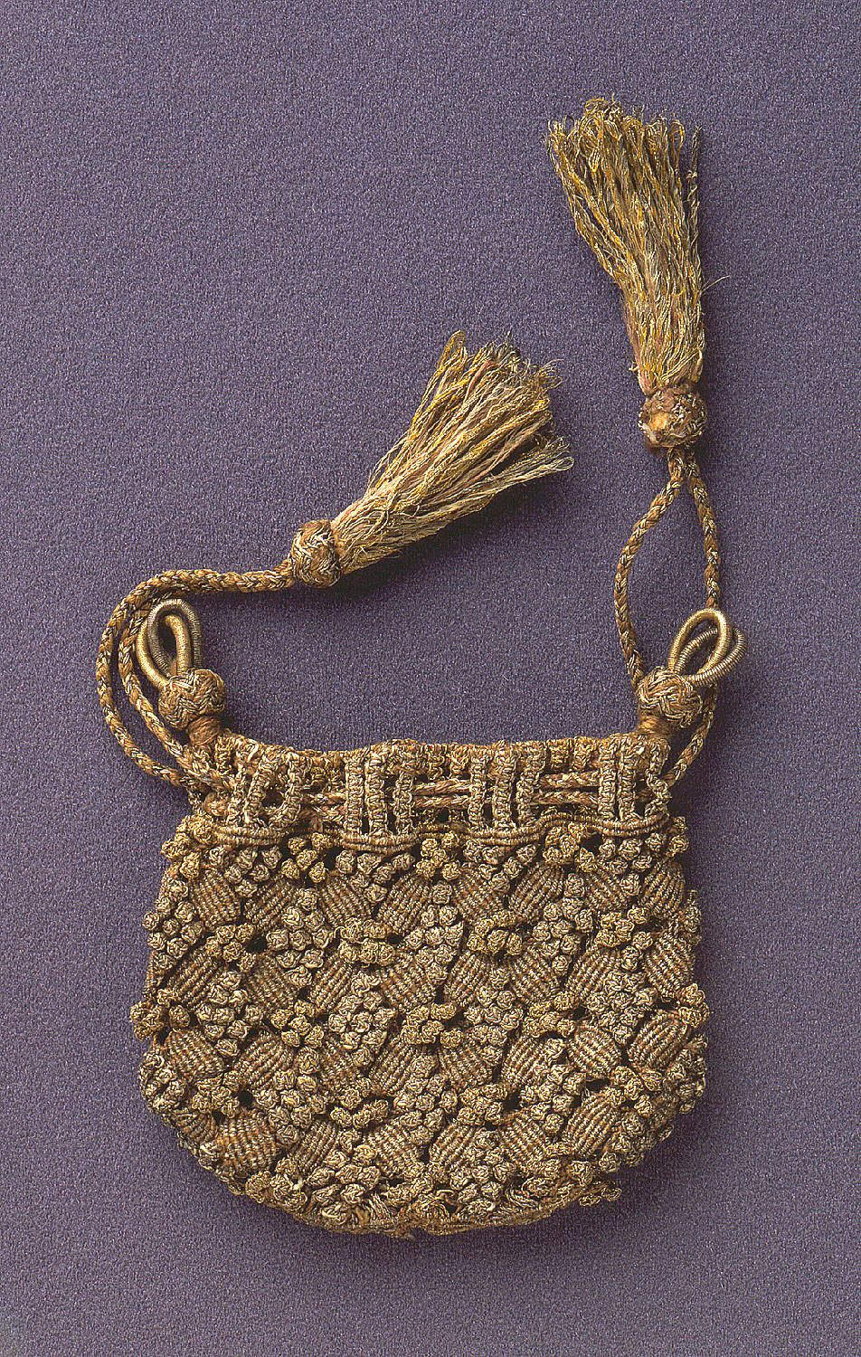This is a Purse. It is dated early 17th century and we acquired it in 1989. Its medium is metallic yarns and its technique is knotting (macramé). It is a part of the Textiles department.