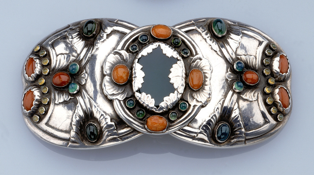 This is a Belt buckle. It was designed by Georg Arthur Jensen and manufactured by Georg Jensen Sølvsmedie. It is dated 1904–08 and we acquired it in 1989. Its medium is silver, agate, amber. It is a part of the Product Design and Decorative Arts department.