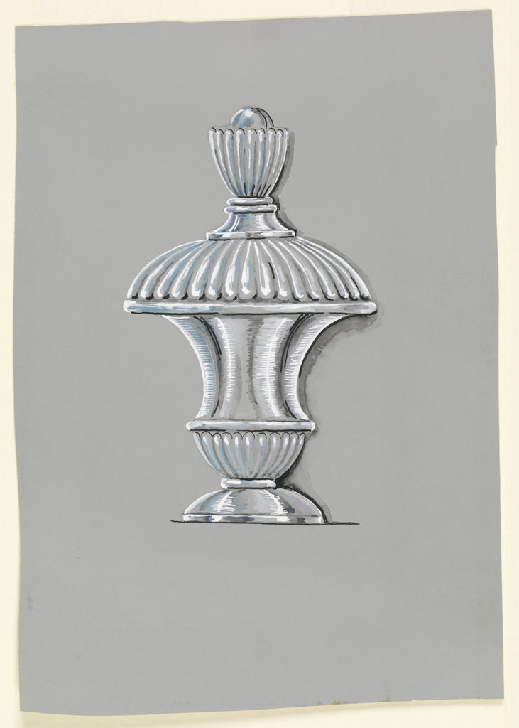 Drawing, Design for a Gadrooned Perfume Bottle; France; brush and black ink, white, blue, gray gouache on cream paper; (irregular): 18 x 12.5 cm (7 1/16 x 4 15/16 in.) Mat: 40.7 x 50.7 cm (16 in. x 19 15/16 in.); Gift of Monique Fink; 1990-149-8