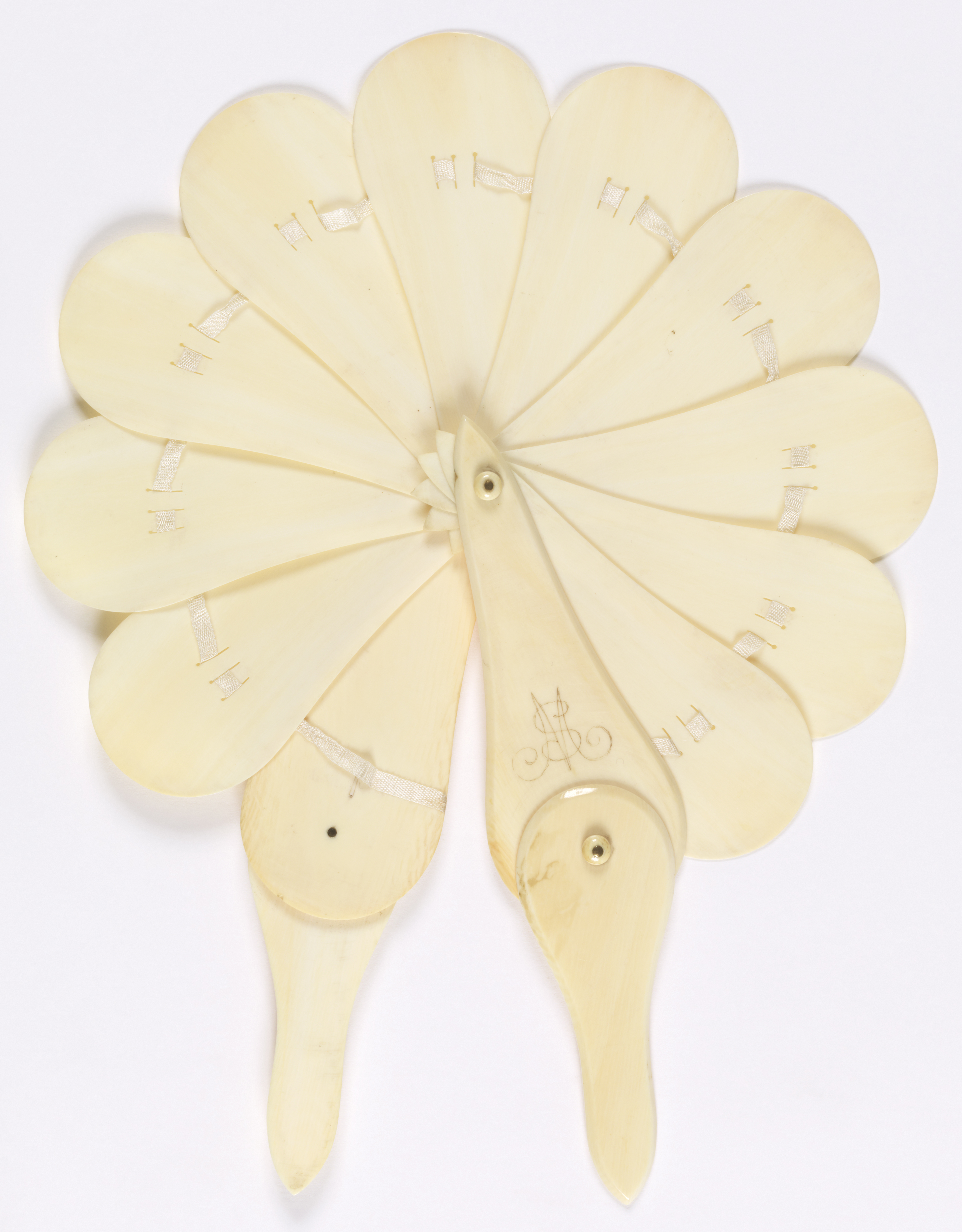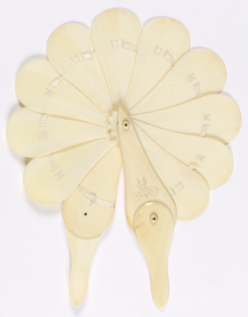 This is a Cockade fan. It is dated ca. 1860 and we acquired it in 1990. Its medium is carved ivory sticks and handle, silk ribbon . It is a part of the Textiles department.