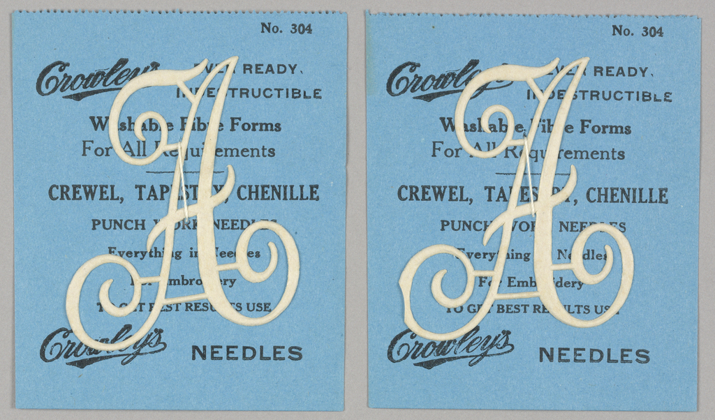 Embroidery Form, Crowley's Fiber Letter Foundations for Embroidery; Distributed by Crowley's Department Store (United States); USA; pressed cotton and synthetic felt, cotton thread, letterpress on colored wove paper; 9.3 x 7.8 cm (3 11/16 x 3 1/16 in.); Gift of Mickey Mariash; 1990-35-13-1,2