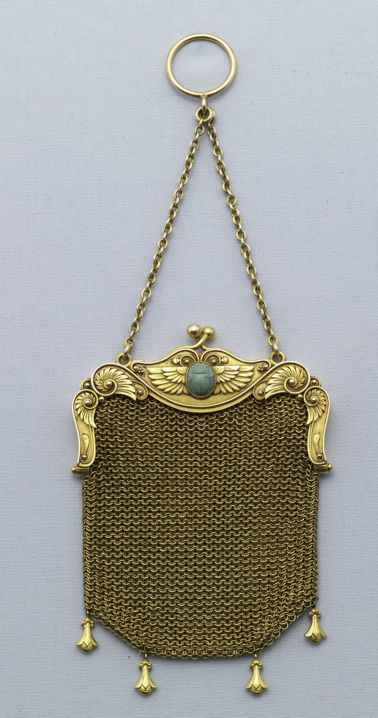 Purse with Egyptian ornament Purse; Made by Sloan & Company; Retailed by Black, Starr and Frost Co. (United States); USA; gold mesh, turquoise; 19.5 L (including ring and chain) x 7.5 W x 1.2 D cm (7 11/16 x 2 15/16 x 1/2 in. ); Gift of Frederick Saal in honor of Dr. and Mrs. Joseph Saal; 1991-160-9