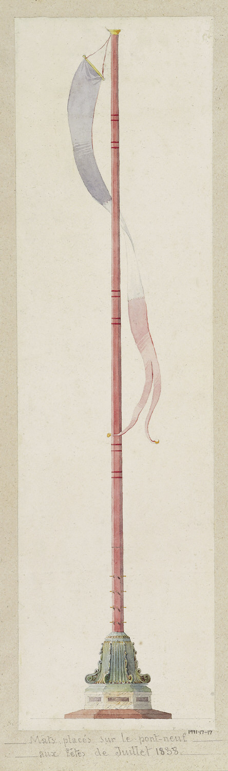 Drawing, Mâts placés sur le Pont-Neuf aux Fêtes de Juillet 1838 (Flagpole for Pont Neuf, Paris, July Festival 1838)