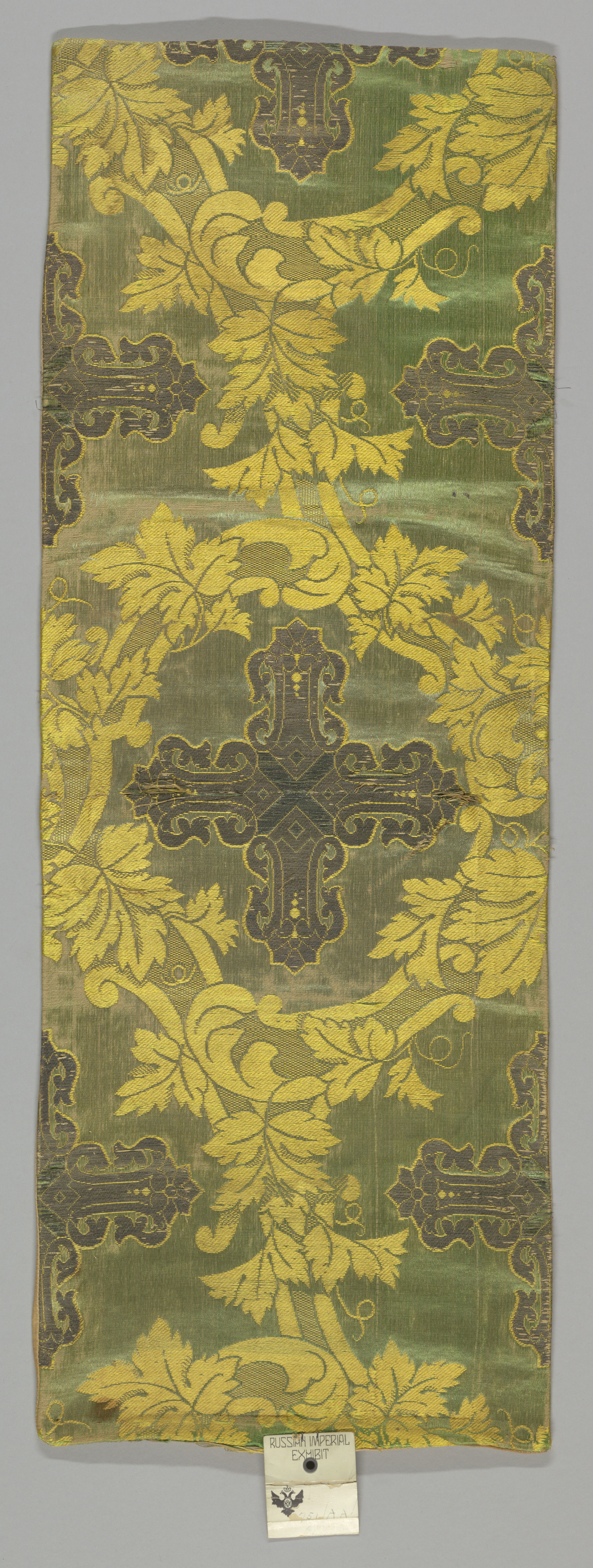 Textile (Russia); silk, cotton, metallic thread; H x W: 70.5 x 25 cm (27 3/4 x 9 13/16 in.) Repeat H: 35.5 cm (14 in.); Gift of Margaret T. Corey; 1991-24-1