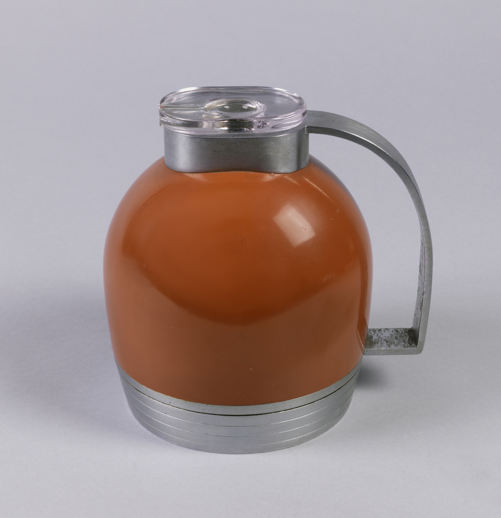 This is a thermos carafe and lid. It was designed by Henry Dreyfuss and manufactured by American Thermos Bottle Co.. It is dated 1936 and we acquired it in 1991. Its medium is aluminum, bakelite, glass. It is a part of the Product Design and Decorative Arts department.
