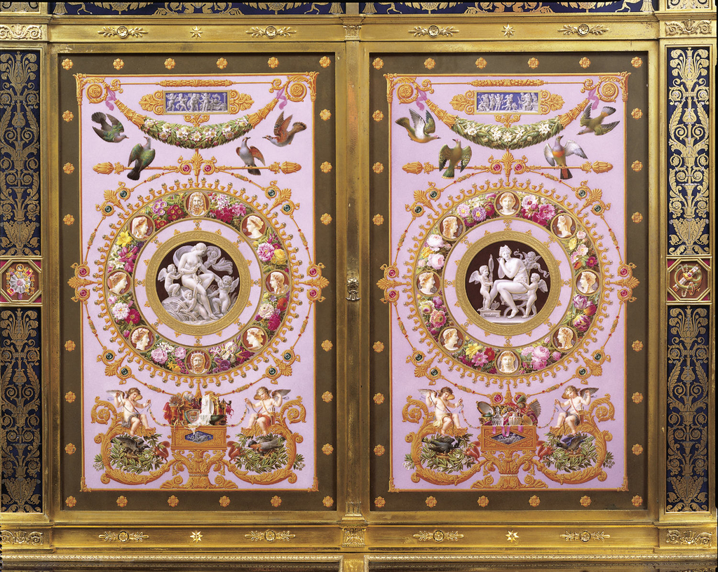 This cabinet was displayed in 1827 at the annual New Year's Day exhibition of the finest products made at the Royal Factory during the previous year. The cabinet was recorded with a sale price of 24,000 francs, an exceptional amount for a piece fo furniture at that time.