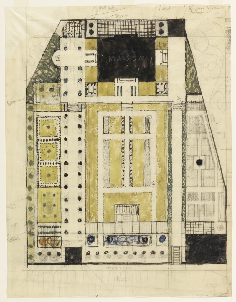 This is a Drawing. It was designed by André Vera and Paul Vera and drafted by Eugène Verdeau. It is dated ca. 1919 and we acquired it in 1991. Its medium is pen and black ink, brush and green, blue, orange watercolor, graphite on tracing paper. It is a part of the Drawings, Prints, and Graphic Design department.