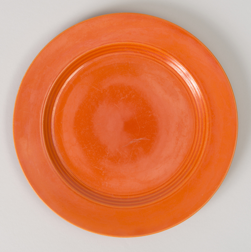 This is a plate. It was manufactured by Homer Laughlin China Company. It is dated 1940–60 and we acquired it in 1991. Its medium is ceramic. It is a part of the Product Design and Decorative Arts department.