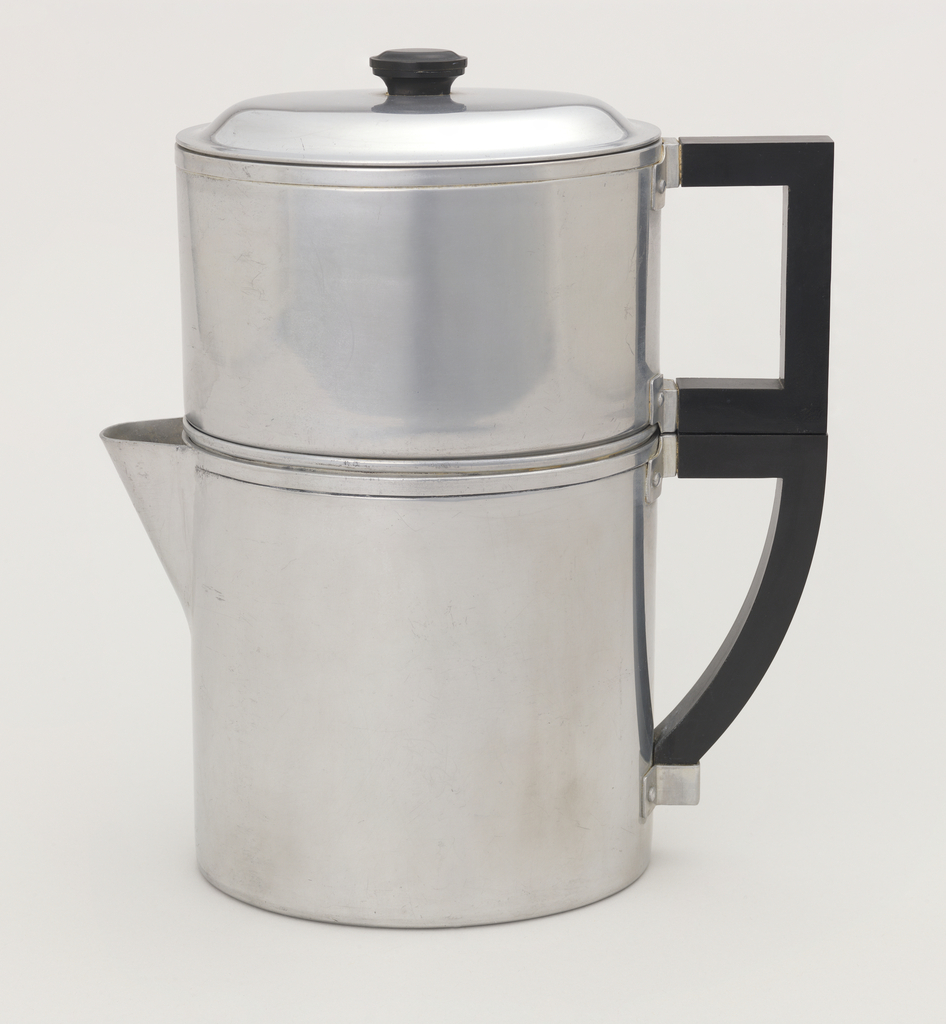 This is a coffee maker. It was designed by Lurelle Van Arsdale Guild and manufactured by Wear-Ever Aluminum Co.. It is dated 1932 and we acquired it in 1991. Its medium is aluminum, bakelite (tm). It is a part of the Product Design and Decorative Arts department.