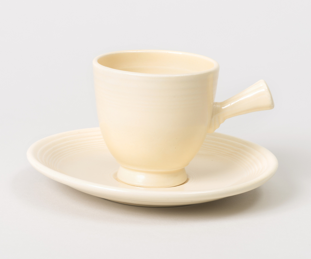 This is a Demitasse Cup. It was manufactured by Homer Laughlin China Company. It is dated 1936–1951 and we acquired it in 1991. Its medium is ceramic, glaze. It is a part of the Product Design and Decorative Arts department.