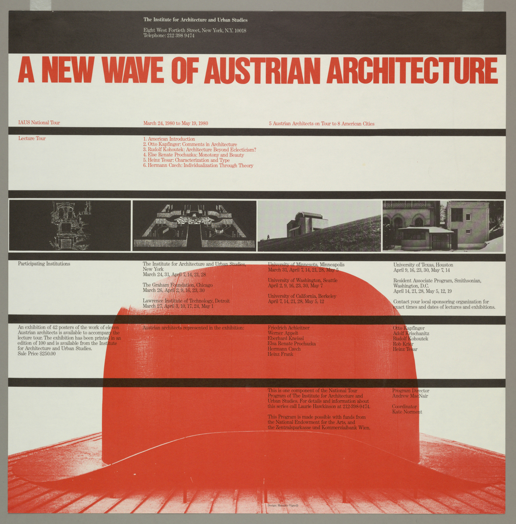 This is a Poster. It was designed by Massimo Vignelli and made for (as the client) Institute for Architecture and Urban Studies. It is dated 1980 and we acquired it in 1991. Its medium is offset lithograph on paper. It is a part of the Drawings, Prints, and Graphic Design department.