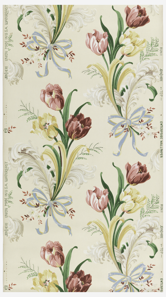 This is a Sidewall. It was manufactured by Enterprise Wallpaper. It is dated 1935–60 and we acquired it in 1991. Its medium is machine-printed, textured ground. It is a part of the Wallcoverings department.