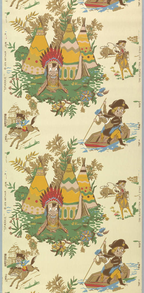 Printed in left selvage: "Sparkie copyright symbol Jon Arthur", printed in right selvedge: "Child Life Wallpaper Inc."
