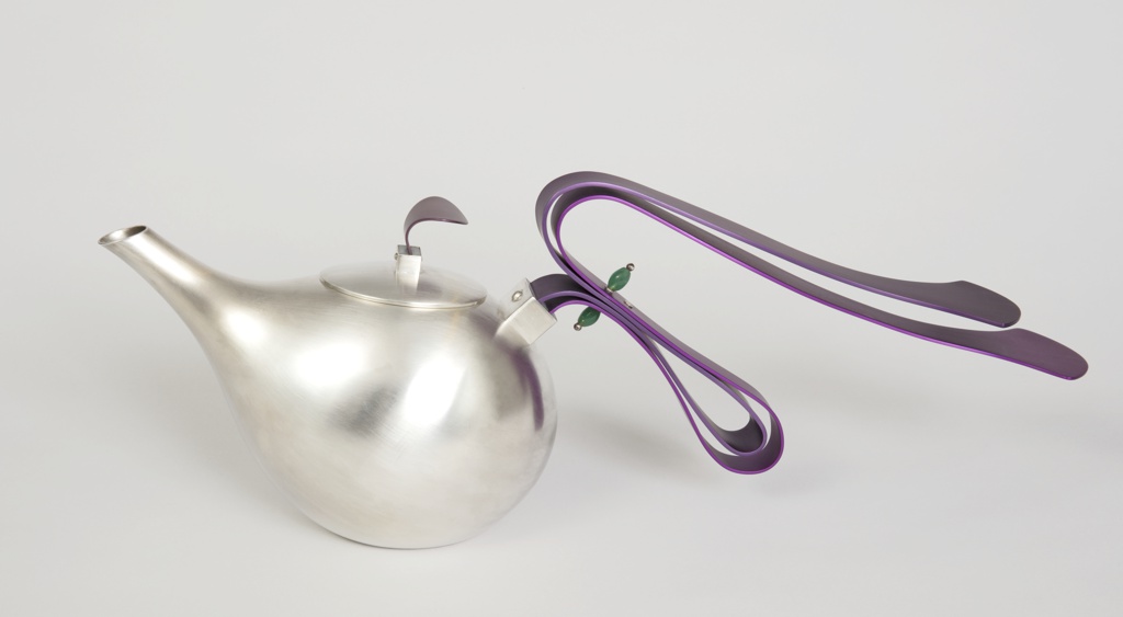 This is a teapot. It was designed by Chunghi Choo and made by Chunghi Choo. It is dated 1988 and we acquired it in 1992. Its medium is silver-plated copper, anodized aluminum, onyx. It is a part of the Product Design and Decorative Arts department.