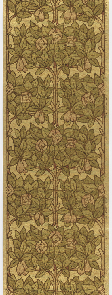 This sidewall and accompanying frieze (1992-38-2) are found in a 1914 Sears & Roebuck sample book held in our collection. The sidewall sold for 48 cents a double roll. The title of the design, The Golden Tiffany, refers to the mottled ground on which the design was printed, an effect produced by blending metallic pigments and mica-based color. Sears repeated the design but printed it on an engraved ground, called it The Morocco, and sold it for 50 cents a double roll—the most expensive paper in the book.