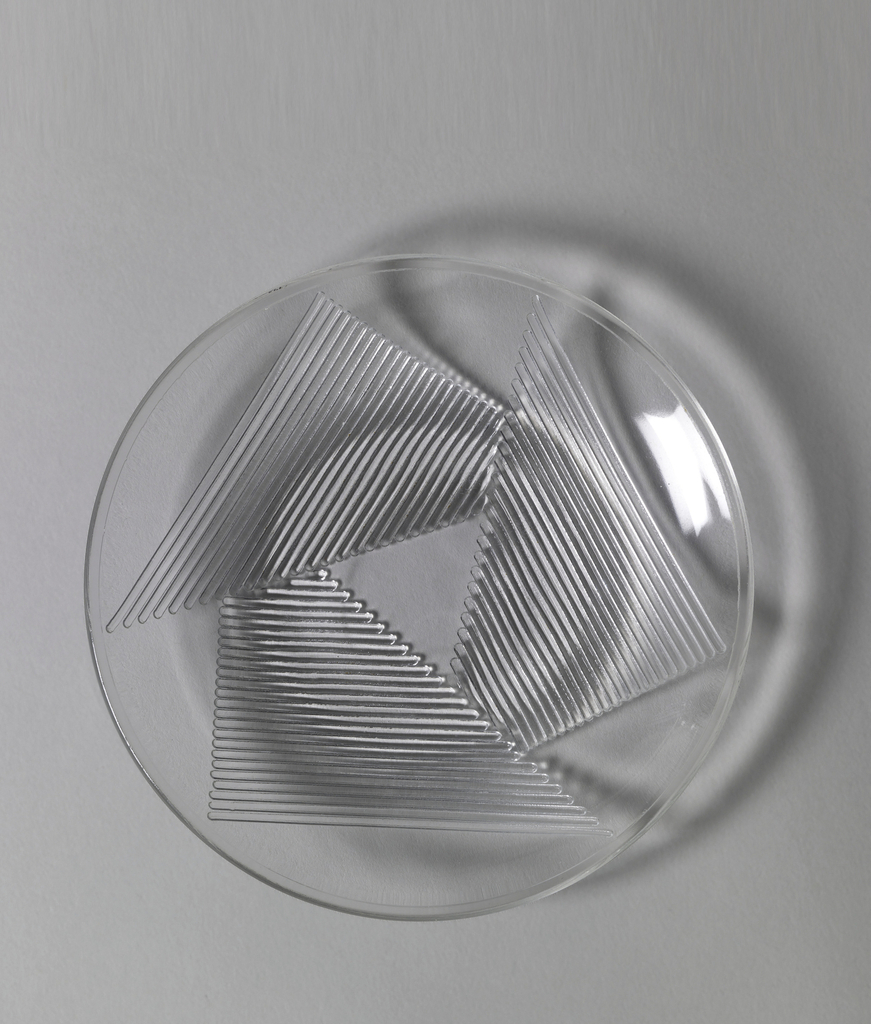 This is a plate. It was designed by Marrku Salo and Markku Salo and produced by iitala/Nuutajarvi. We acquired it in 1992. Its medium is glass. It is a part of the Product Design and Decorative Arts department.