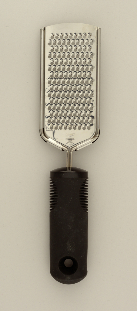 Good Grips Grater; Designed by Davin Stowell (American, b. 1953), Tucker Viemeister (American, b. 1948), Daniel Formosa (American, b. 1953), Stephen Russak (American, b. 1962), Stephen Allendorf (American, b. 1954), Michael Calahan (American, b. 1965), Jürgen Laub (German, b. 1964), Stephen Wahl (American,); Manufactured by OXO International (United States); Firm: Smart Design, Inc. (United States); USA; steel (stainless), santoprene (thermoplastic rubber); 25.4 cm x 5.1 cm x 2.5 cm (10 in. x 2 in. x 1 in.); Gift of OXO; 1992-52-6