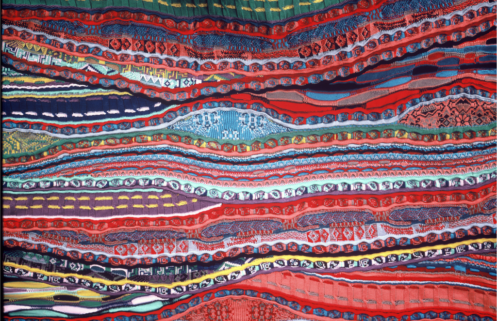 This is a panel. It was produced by COOGI AUSTRALIA. It is dated 1991 and we acquired it in 1992. Its medium is cotton and its technique is machine knit. It is a part of the Textiles department.