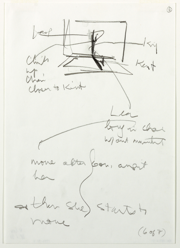 Drawing, Design for King Lear, Scene II: Study with Tall Chair, Long Bed, and Artist's Notes; USA; graphite on white paper; Sheet: 29.6 x 20.9 cm (11 5/8 x 8 1/4 in.) Image: 6.9 x 9.4 cm (2 11/16 x 3 11/16 in.); Museum purchase through gift of the Advisory Council and bequest of Mary Hearn Greims and from Sarah Cooper-Hewitt Fund; 1992-90-8