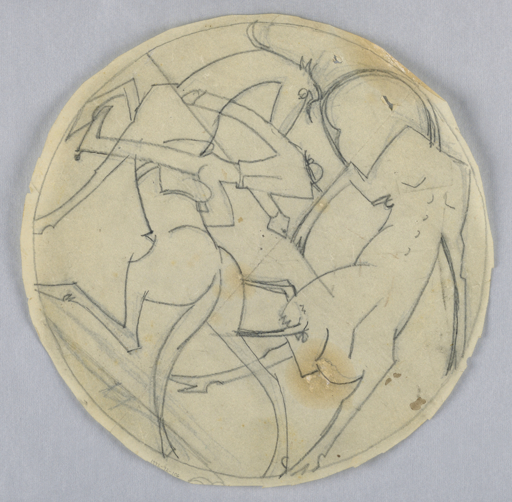 Drawing, Design for Plate, Bull Fighter on Horse; Designed by William Hunt Diederich (American, b. Hungary, 1884–1953); USA; graphite on tracing paper; 27.3 x 27.6 cm (10 3/4 x 10 7/8 in.); Gift of Diana Diederich Blake; 1992-92-106