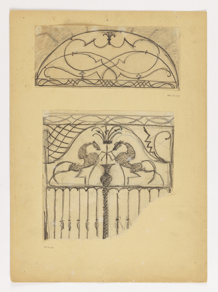 Drawing, Design for Gate, Horses; Designed by William Hunt Diederich (American, b. Hungary, 1884–1953); USA; black crayon, graphite, color pencil on paper mounted on ribbed paper; 18.5 x 19 cm (7 5/16 x 7 1/2 in.); Gift of Diana Diederich Blake; 1992-92-135