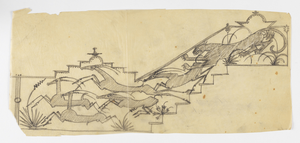 Drawing, Design for a Stair Rail, Panther Chasing Ibex; Designed by William Hunt Diederich (American, b. Hungary, 1884–1953); USA; graphite on tracing paper; 20.5 x 46.1 cm (8 1/16 x 18 1/8 in.); Gift of Diana Diederich Blake; 1992-92-98