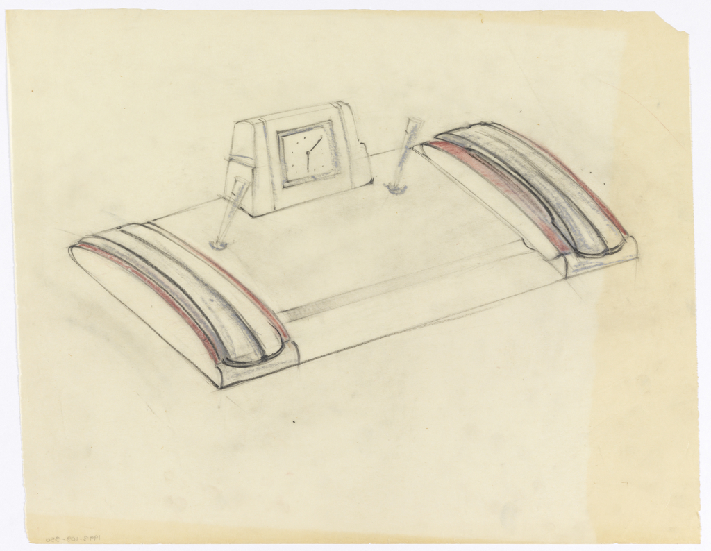 <ref name=CH>{{cite web |url=https://www-4.collection.cooperhewitt.org/objects/18642661/ |title=Drawing, Clock on Desk Stand with Pen and Pencil Holders |author=Cooper Hewitt, Smithsonian Design Museum |accessdate=20 December 2025 |publisher=Smithsonian Institution}}</ref>