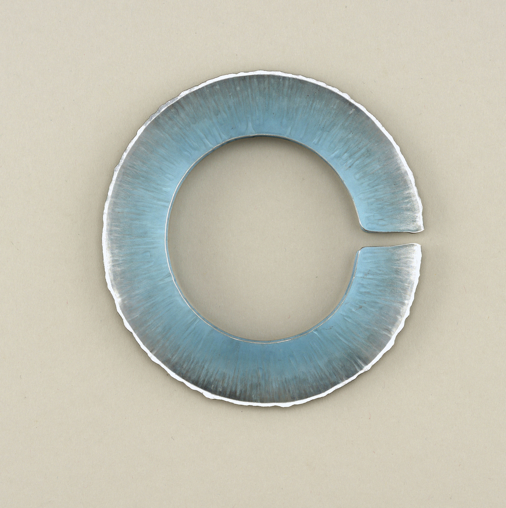 This is a bracelet. We acquired it in 1993. Its medium is aluminum (anodized). It is a part of the Product Design and Decorative Arts department.