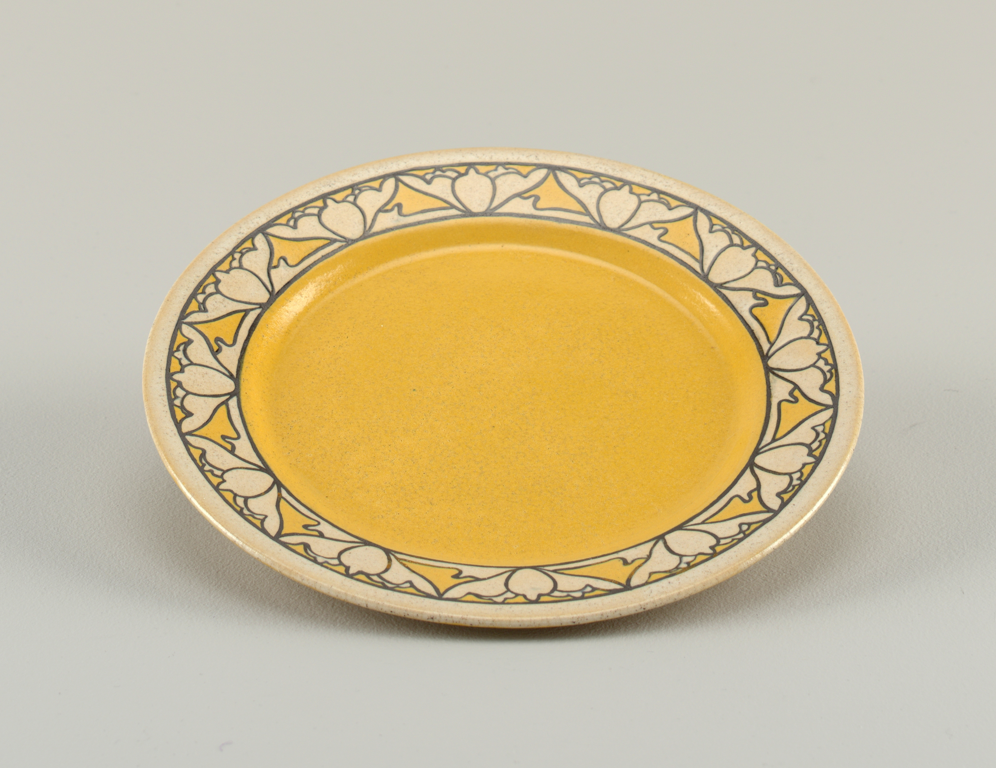 This is a plate. It was designed by Fanny Levine and made by Saturday Evening Girls Club. It is dated 1917 and we acquired it in 1993. Its medium is glazed earthenware. It is a part of the Product Design and Decorative Arts department.
