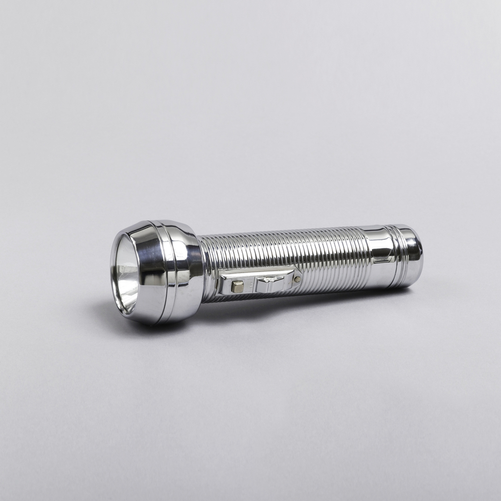 This is a flashlight. It is dated ca. 1970–85 and we acquired it in 1993. Its medium is chrome-plated metal. It is a part of the Product Design and Decorative Arts department.