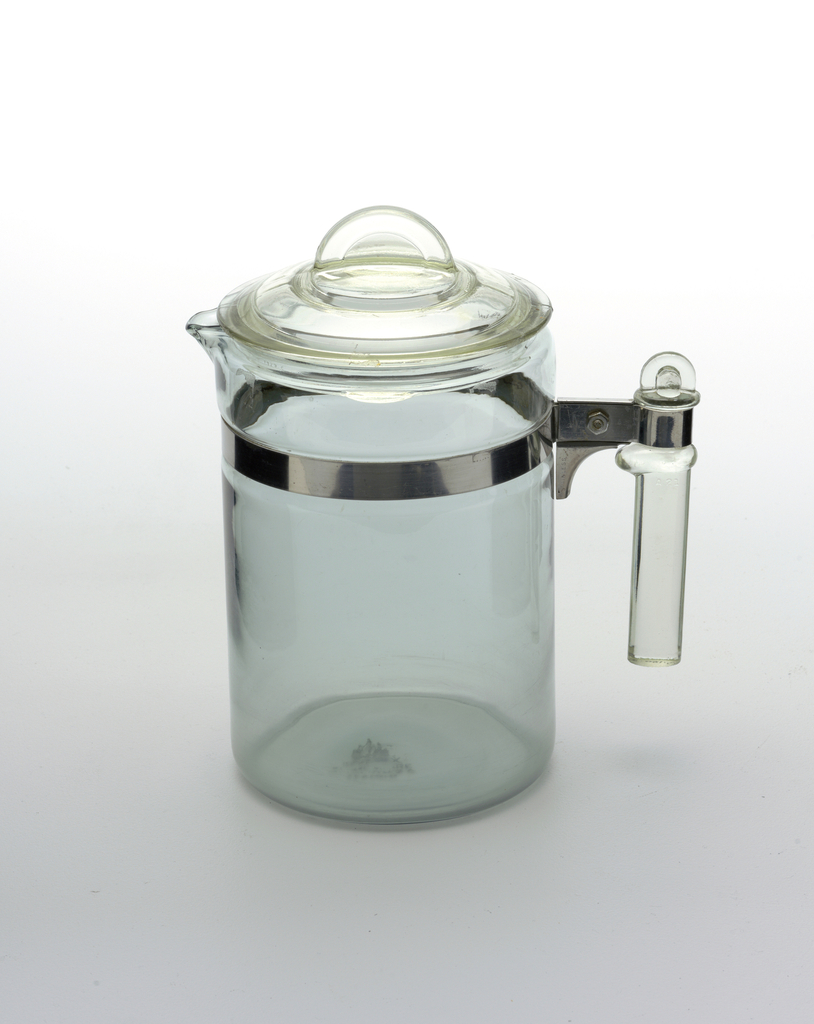 This is a water kettle. We acquired it in 1993. Its medium is glass. It is a part of the Product Design and Decorative Arts department.