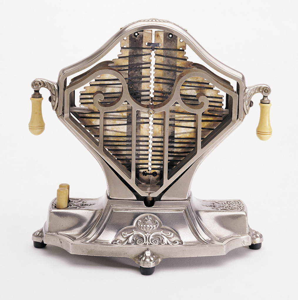 This is a Toaster. It is dated ca. 1929 and we acquired it in 1993. Its medium is cast metal, ivorine. It is a part of the Product Design and Decorative Arts department.