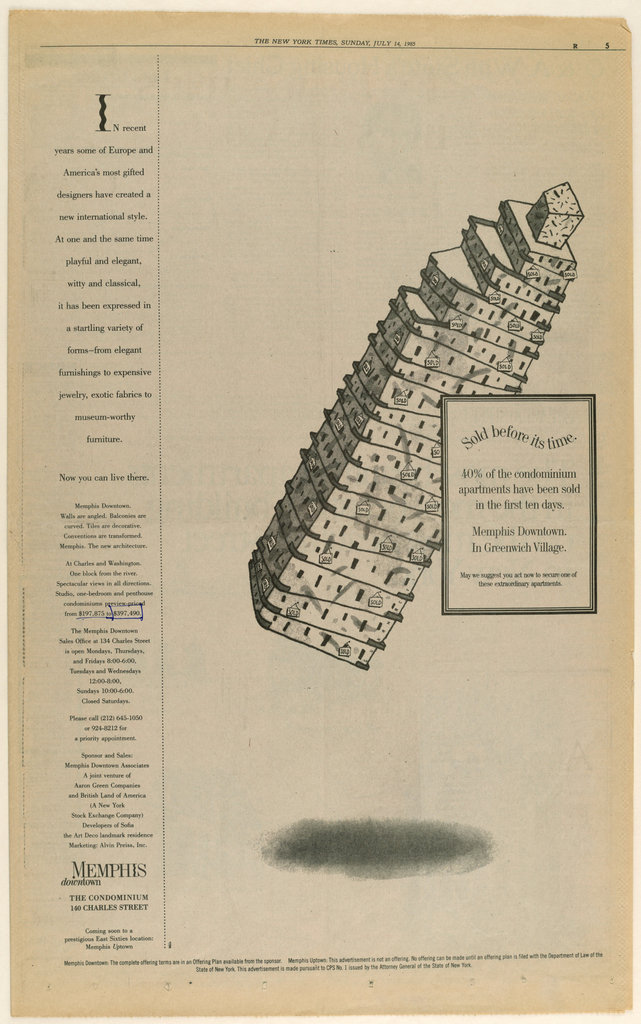 <ref name=CH>{{cite web |url=https://www-4.collection.cooperhewitt.org/objects/18644037/ |title=Advertisement, Memphis (Condominiums): New York Times Advertisement |author=Cooper Hewitt, Smithsonian Design Museum |accessdate=19 December 2025 |publisher=Smithsonian Institution}}</ref>