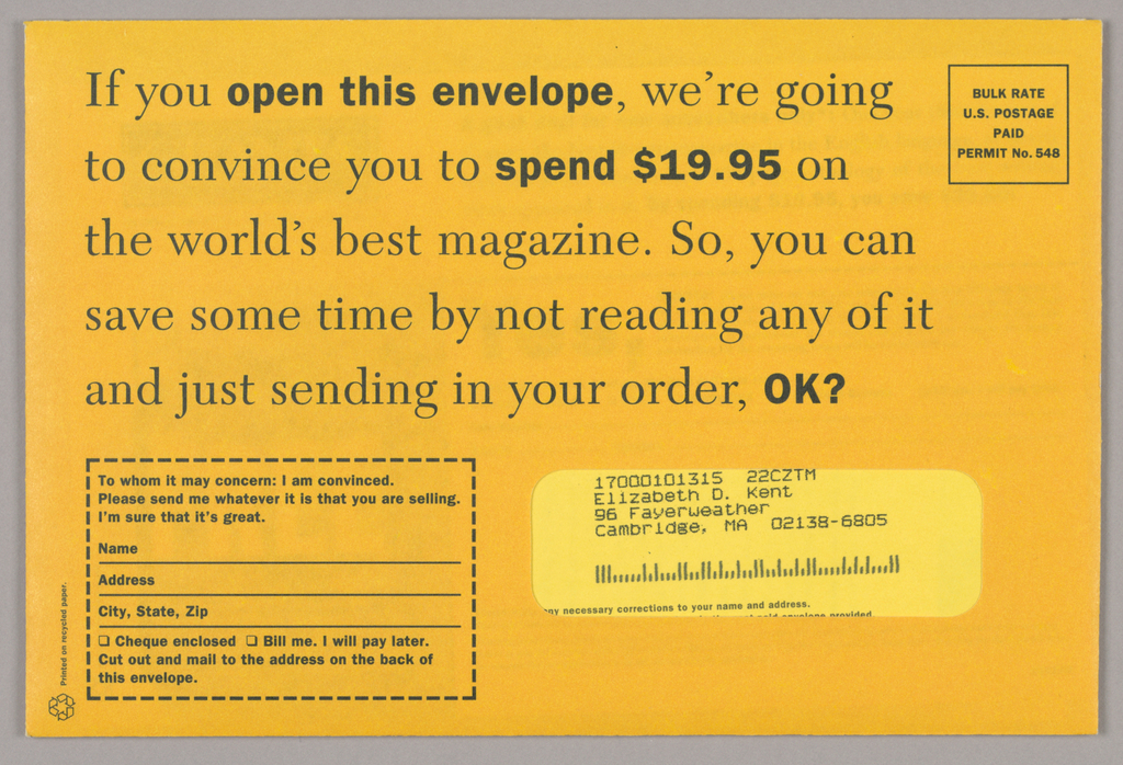 Mailer, Granta: If you open this envelope...; Design Director: Tibor Kalman (American, b. Hungary, 1949–1999); Firm: M&Co (United States); USA; offset lithography; 1993-151-171a - 15.2 x 22.6 cm (6 x 9 in.), large envelope 1993-151-171b - 13.5 x 21.5 cm (5 7/8 x 8 1/2 in.), form 1993-151-171c - 9.5 x 17 cm (3 3/4 x 6 3/4 in.), small envelope 1993-151-171d - 18.7 x 12.0 (7 3/8 x 4 11/16 in.), flyer (what's a Granta), closed 1993-151-171d - 18.7 x 74 cm (7 3/8 x 32 1/4 in.), flyer (what's a Granta), opened 1993-151-171e - 14 x 21.7 cm (5 1/2 x 8 1/2 in.), flyer (because...), closed 1993-151-171e - 27.7 x 43 cm (8 1/2 x 21 7/8 in.), flyer (because...), opened; Gift of Tibor Kalman/ M & Co.; 1993-151-171-a/e