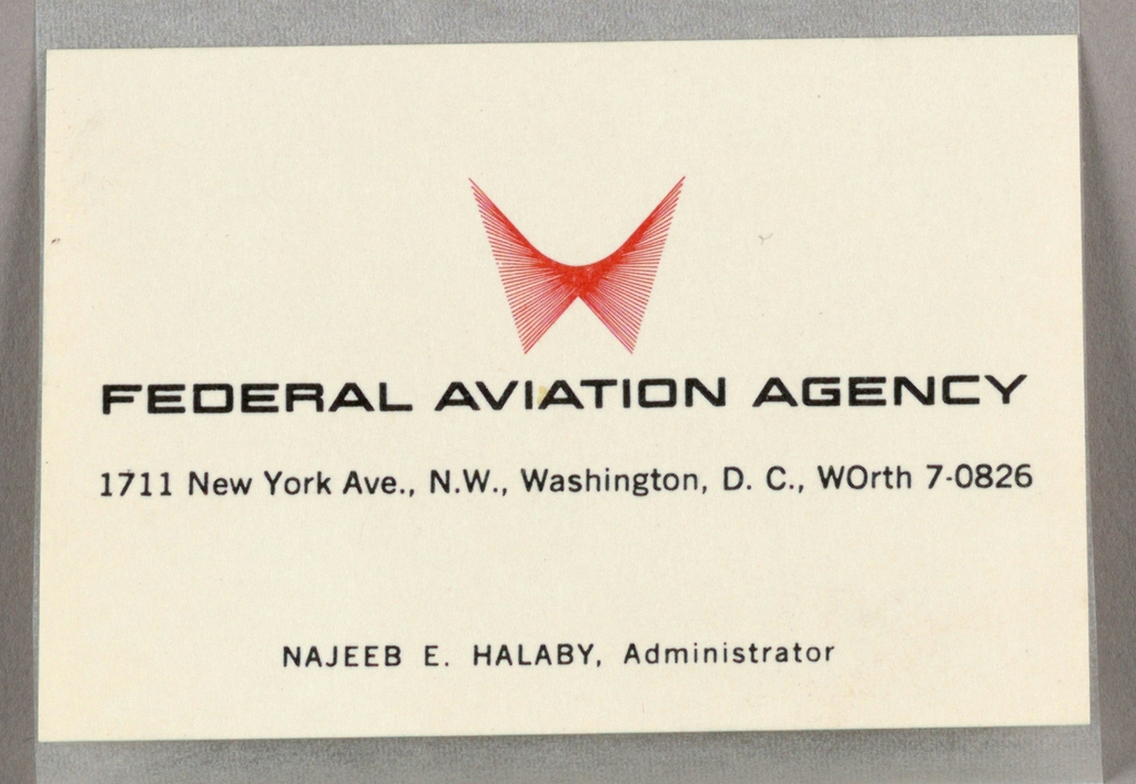 Business Card, Federal Aviation Agency; Designed by Elaine Lustig Cohen (American, 1927–2016); USA; offset lithograph on white wove paper; H x W: 6.1 x 9.1 cm (2 3/8 x 3 9/16 in.); Gift of Tamar Cohen and Dave Slatoff; 1993-31-105-2