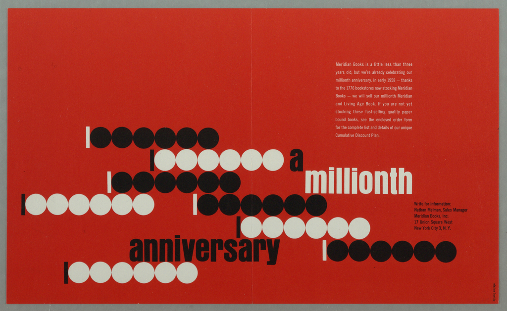 Printed in black and white, between geometric forms: a / millionth / anniversary; in white, upper right: Meridian books is a little less than three / years old, but we're already celebrating our / millionth anniversary. In early 1958 -- thanks / to the 1776 bookstores now stocking Meridian / Books -- we will sell our millionth Meridian / and Living Age Book. If you are not yet / stocking these fast-selling quality paper / bound books, see the enclosed order form / for the complete list and details of our unique / Cumulative Discount Plan.; in black, lower right: Write for information: / Nathan Melman, Sales Manager / Meridian Books, Inc. / 17 Union Square West / New York City 3, N.Y; in black, vertically at bottom right: elaine lustig