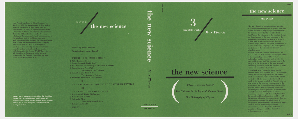 Printed in black, back cover upper left: Max Planck was born in Kiel, Germany, on / April 23, 1858. He was educated in Kiel and in / Munich, and taught in both cities until his / appointment, in 1889, to a professorship at the / University of Berlin. He originated the quantum / theory in 1901, and is known also for work / relating in thermodynamics and mechanics and to / electrical and optical problems associated / with radiation of heat and with the quantum theory. / Max Planck was awarded the Nobel Prize for / Physics in 1918. He died in Göttingen on / October 4, 1947 (shortly before his ninetieth / birthday), after acute physical and mental / suffering during the Second World War – he was / left homeless by bombings and a son was / executed by the Gestapo (his oldest son was killed in the First World War).; in white, back cover lower left: GREENWICH EDITIONS, published by Meridian / Books, Inc., are clothbound publications of / original works which will not appear in any cheaper / edition for at least two years from the date of / their publication.; in white, back cover right: CONTENTS / the new science; in black, back cover right: Preface by Albert Einstein / Introduction by James Franck / I / WHERE IS SCIENCE GOING? / 1 Fifty Years of Science / 2 Is the External World Real? / 3 The Scientist’s Picture of the Physical Universe / 4 Causation and Free Will / Statement of the Problem / 5 Causation and Free Will / The Answer of Science / 6 From the Relative to the Absolute / II / THE UNIVERSE IN THE LIGHT OF MODERN PHYSICS / III / THE PHILOSOPHY OF PHYSICS / 1 Physics and World Philosophy / 2 Causation in Nature / 3 Scientific Ideas / Their Origin and Effects / 4 Science and Faith / INDEX; in black and white, spine: the new science Max Planck Greenwich / Meridian; in black, vertically, front cover upper left: elaine lustig; in white, front cover upper center: 3 / complete works / Max Planck; in black, front cover lower center: the new science / Where is Science Going? / The Universe in the Light of Modern Physics / The Philosophy of Physics; in white, front cover upper right: the new science / Max Planck; in black, front cover right: “His work has given one of the most powerful / of all impulses to the progress of science. His ideas / will be effective as long as physical science lasts.” / Albert Einstein wrote these words about / Max Planck, the originator of the quantum theory / and therefore one of the most important of the / innovators who changed the course of science. / In The New Science are collected three of / Planck’s major writings, in which he examines – in clear and simple language – the philosophical / implications of the scientific revolution he / helped to create. / Einstein wrote that “human nature always has / tried to form for itself a simple and synoptic image / of the surrounding world.” The poet, the / philosopher, and the scientist each creates his / own world picture, and “the supreme task of the / physicist is the discovery of the most general elementary laws from which the [scientist’s] world / picture can be deduced logically.” / In this book Max Planck elucidates for the / common reader this “supreme task.” The twentieth- / century revolutions in politics and art cannot / match in excitement our new knowledge of the / physical world, the most spectacular result of / which is the atomic bomb. But Planck’s interest / here is not in the practical consequences of the / new science, but in something much deeper. His question is this: How do these new discoveries / affect the philosophical problems that have always / haunted mankind? / Although he is almost / obsessively concerned with the new light shed on / the eternal problems of causation and free will, this eminent physicist also demonstrates how the new science transforms the whole range of / metaphysics. Readers of every philosophical bias -- / whether that of traditional philosophy, / existentialism, or the linguistic criticism of / speculative thought – will find stimulation / in these provocative pages.