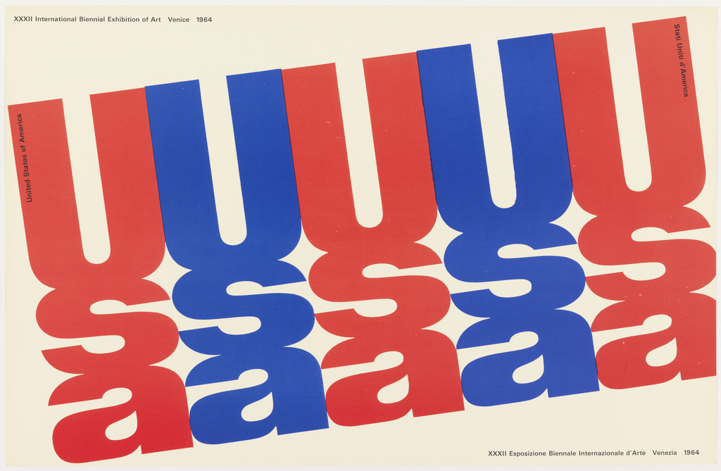 Printed in black, upper left: XXXII International Biennial Exhibition of Art Venice 1964; lower right corner: XXXII Espozitione Biennale Internazionale d'Arte Veniezia 1964; vertically in "U" on left: United States of America; in "U" on right: Stati Uniti d'America