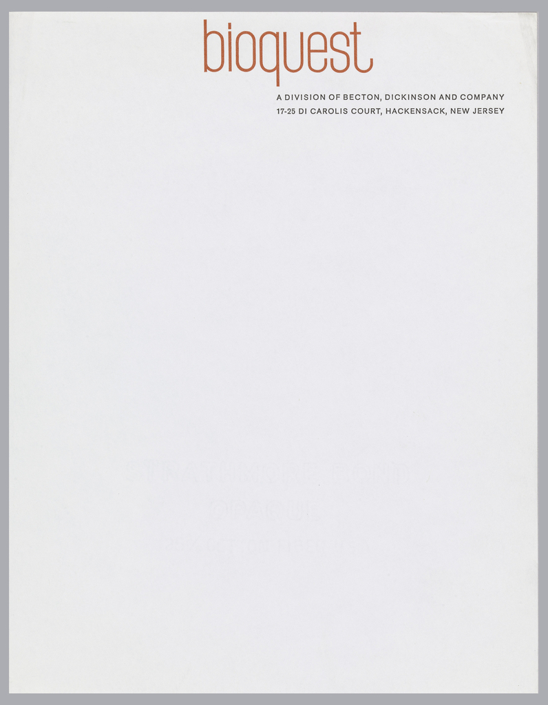 Letterhead, Bioquest; Designed by Elaine Lustig Cohen (American, 1927–2016); USA; lithograph on off-white wove paper; H x W: 27.9 x 21.6 cm (11 in. x 8 1/2 in.); Gift of Tamar Cohen and Dave Slatoff; 1993-31-82-1
