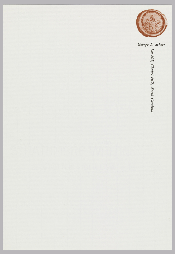 Printed in black, upper right: George F. Scheer; in black, vertically, right: box 807, Chapel Hill, North Carolina