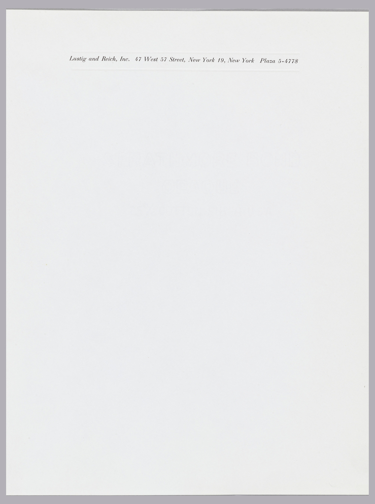 Printed in black, at top: Lustig and Reich, Inc. 47 West 57 Street, New York 19, New York Plaza 5-4778