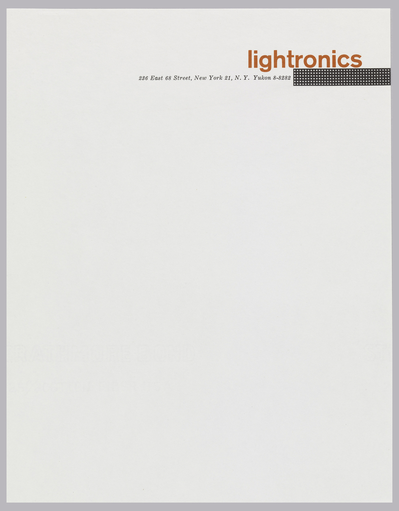 Letterhead, Lightronics, 236 East 68th Street, New York, NY; Designed by Elaine Lustig Cohen (American, 1927–2016); USA; lithograph on off-white wove paper; H x W: 27.5 x 21.4 cm (10 13/16 x 8 7/16 in.); Gift of Tamar Cohen and Dave Slatoff; 1993-31-88-1