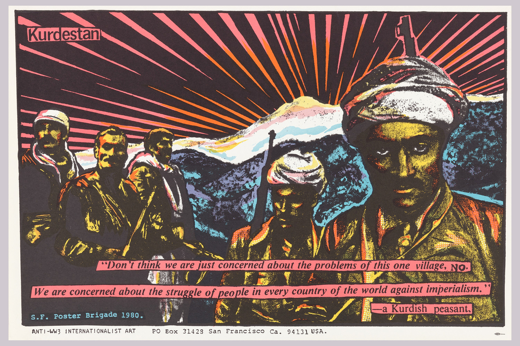 Other text: ""Don't think we are just concerned about the problems of this one village, no. / We are concerned about the struggle of people in every country of the world against imperialism." / -a Kurdish peasant" Inscription in blue ink at LL: "S.F. Poster Brigade 1980." Inscription in black ink at LC: "ANTI-WW# Internationalist Art PO Box 31428 San Francisco Ca. 94131 USA."