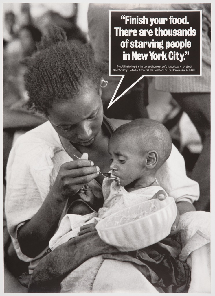 Poster, "Finish your food. There are thousands of starving people in New York City"; Designed by Peter Cohen, Jamie Barrett; Client: Coalition for the Homeless; USA; lithograph on white paper; 62.7 × 45.3 cm (24 11/16 × 17 13/16 in.); Gift of Steven Heller and Karrie Jacobs; 1993-53-81