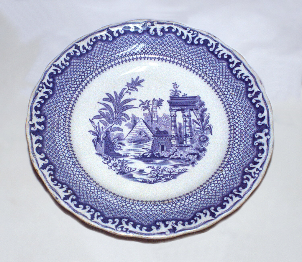 This is a plate. It was manufactured by Rorstrand. It is dated ca. 1885 and we acquired it in 1993. Its medium is earthenware, transfer-printed decoration. It is a part of the Product Design and Decorative Arts department.