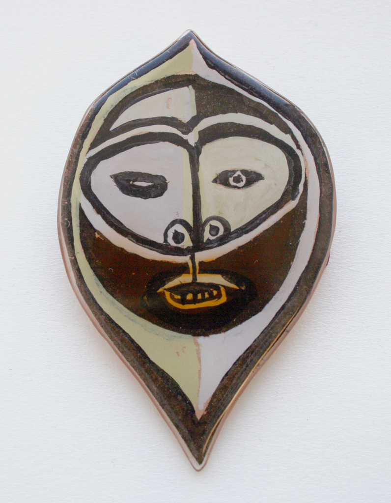 This is a Pin. It was created by David Vestal and designed by David Vestal. We acquired it in 1993. Its medium is plastic, copper paint. It is a part of the Product Design and Decorative Arts department.
