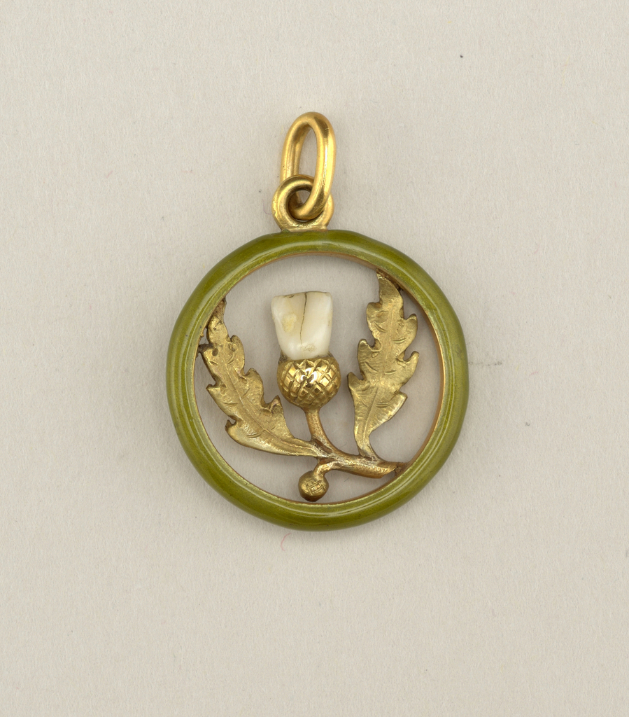 This is a Pendant. It is dated ca. 1910 and we acquired it in 1995. Its medium is gold, enamel, tooth. It is a part of the Product Design and Decorative Arts department.