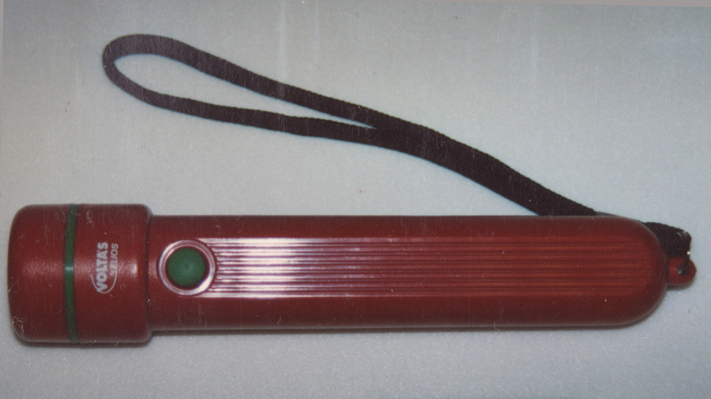 This is a flashlight. It is dated 1980 and we acquired it in 1994. Its medium is plastic. It is a part of the Product Design and Decorative Arts department.