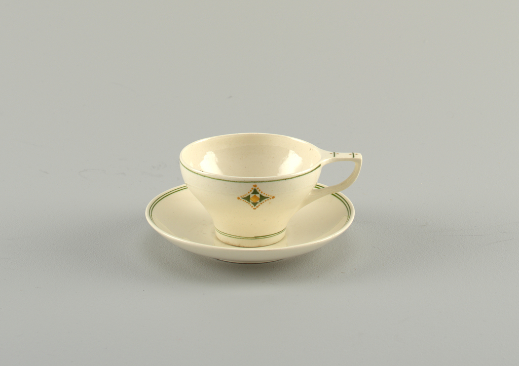 This is a cup and saucer. It was designed by Christian Johannes van der Hoef and manufactured by Amphora Factory. It is dated ca. 1908 and we acquired it in 1994. Its medium is earthenware. It is a part of the Product Design and Decorative Arts department.