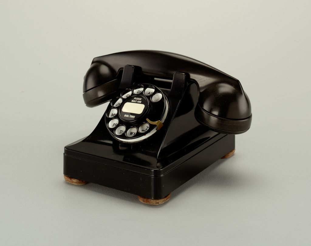 This elegant sculptural telephone has sidewalls that swoop upward from a rectangular base. It resembles an earlier phone introduced in Sweden in 1931, designed by Jean Heiberg for Ericsson. The Swedish model is housed in Bakelite, a hard plastic that was considered an innovative modern material; the Model 302 was manufactured in metal—a more traditional material—until 1946.
